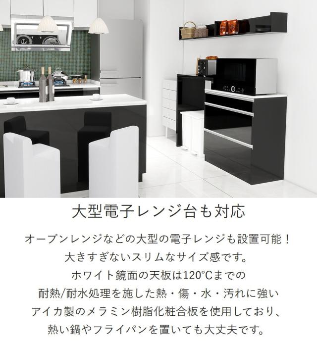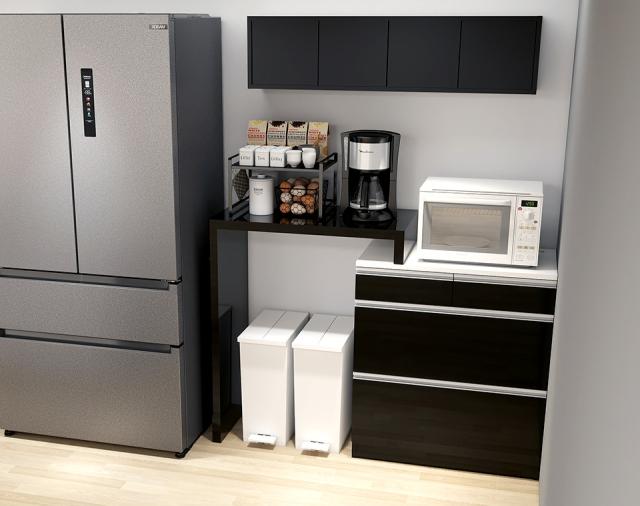 電子レンジ台 キッチンカウンター コンセント付き 大型電子レンジ対応 作業台 カウンターテーブル 炊飯器 引き出し レンジボード ゴミ箱収納 スチームオーブンレンジ台 食器棚 ブラック 高級感 鏡面 【RDW-0083/PlusOneコの字/black/約幅84〜158cm奥行44cm高さ94cm】 ☆