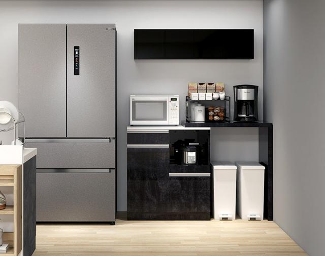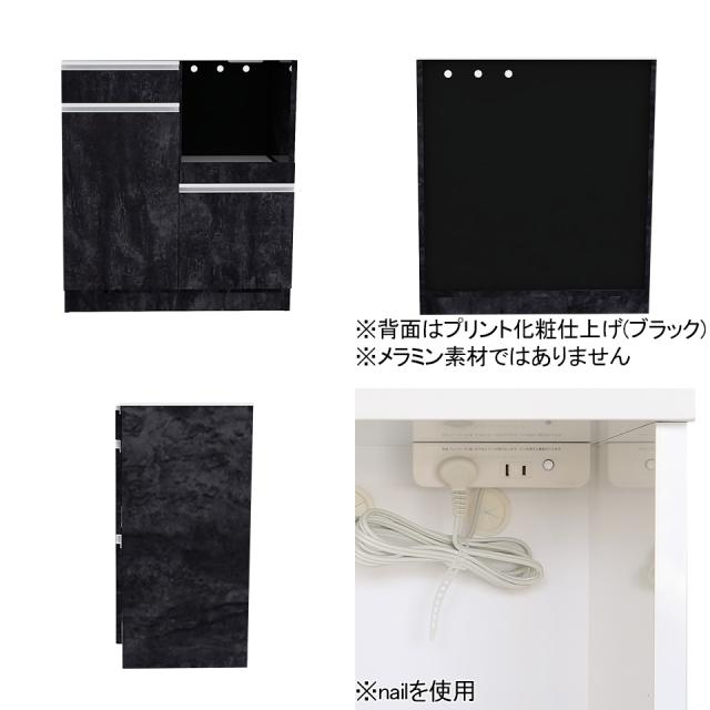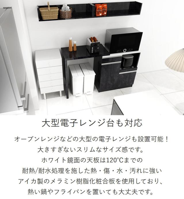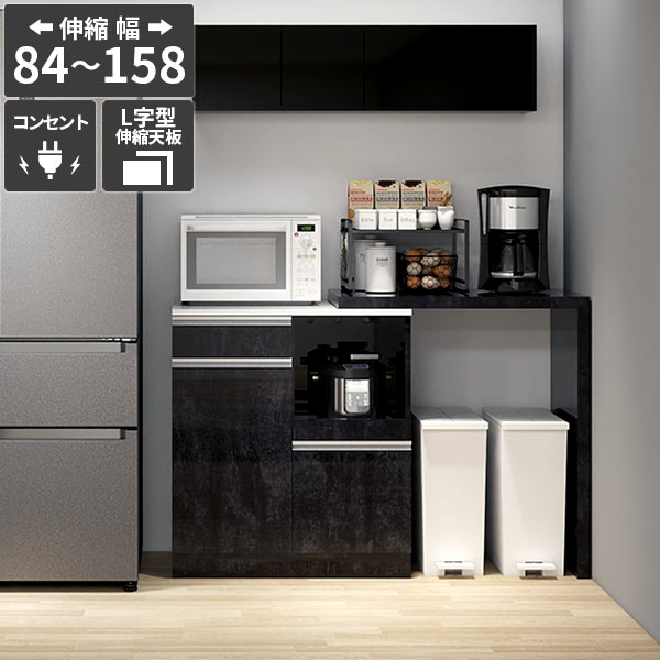 レンジボード 食器棚 電子レンジ台 キッチンカウンター 引き出し おしゃれ コンセント ゴミ箱上ラック 炊飯器 レンジラック 伸長テーブル 台所収納 キッチン収納 大容量 北欧 日本製 大理石調 ブラック 鏡面 【RDW-002/PlusOneL字/BP/約幅84〜158cm奥行44cm高さ94cm】 ☆