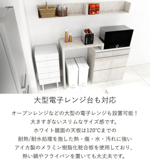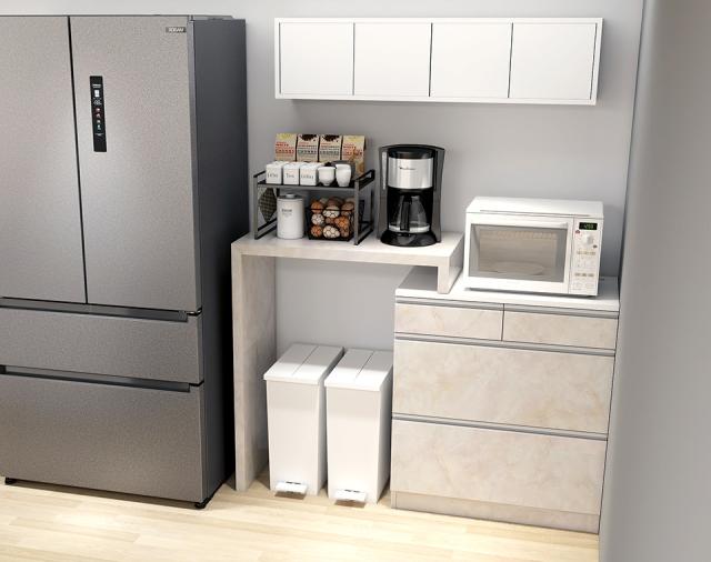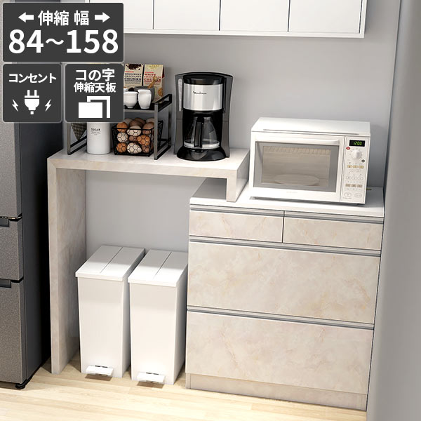 レンジ台 食器棚 キッチンボード 電子レンジ台 おしゃれ コンセント付き 伸縮テーブル キッチンカウンター ごみ箱収納 伸長 大型電子レンジ対応 収納 引き出し パントリー収納 台所 大理石調 鏡面 マーブル 【RDW-0083/PlusOneコの字/MB/約幅84〜158cm奥行44cm高さ94cm】 ☆