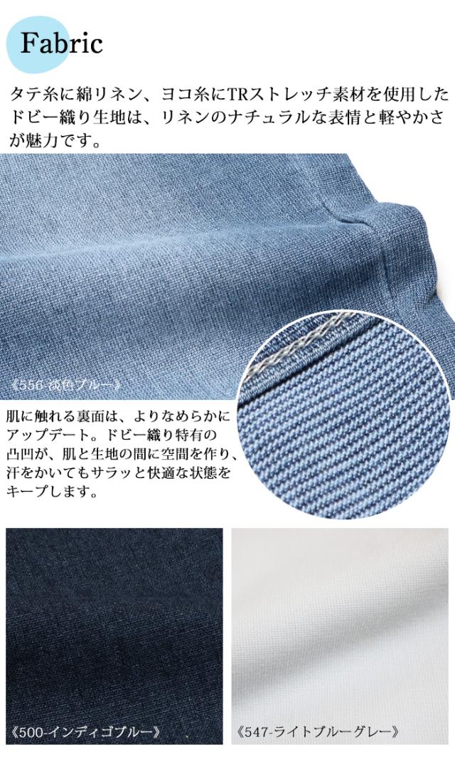 《500-インディゴブルー/556-淡色ブルー》 綿 46%、ポリエステル 24%、麻 16%、レーヨン 10%、ポリウレタン 4% 《547-ライトブルーグレー》 綿 46%、ポリエステル 28%、レーヨン 12%、麻 11%、ポリウレタン 3% |