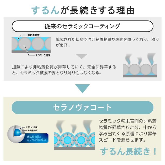 こびりつきにくい特殊セラミック加工(セラノヴァコート)により、使いはじめの「するん」が長持ち!