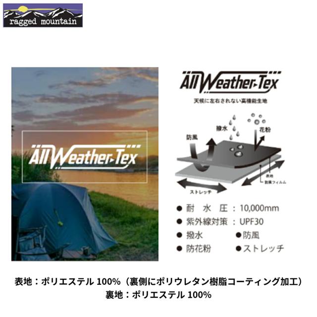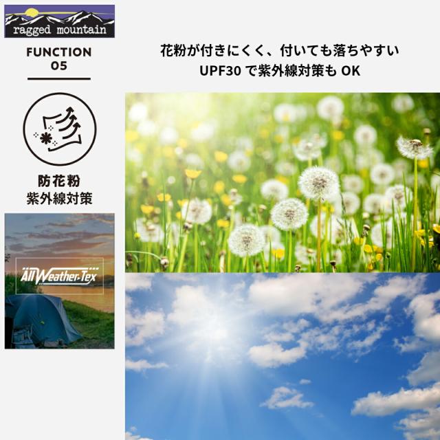 ALL WEATHER-TEX を使用。撥水・防風・ストレッチ・生地耐水圧1000mm。紫外線対策 UPF30。生地に花粉がついても落ちやすい。無地や切替デザインなどカラーバリエーションも豊富です。どんな気候にも合わせやすく、アウトドアシーンからタウンユースまで幅広く使える万能アウターです。裏地にはメッシュ素材を使用し、湿気がこもりにくいです。メンズ・レディース問わずユニセックスでの着用もおすすめです。ウインドブレーカー・レインコート的な使い方もできます。