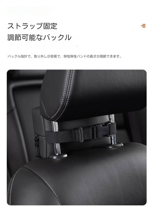 ・取り付け用ベルトで、ヘッドレストに固定するだけの簡単装着。