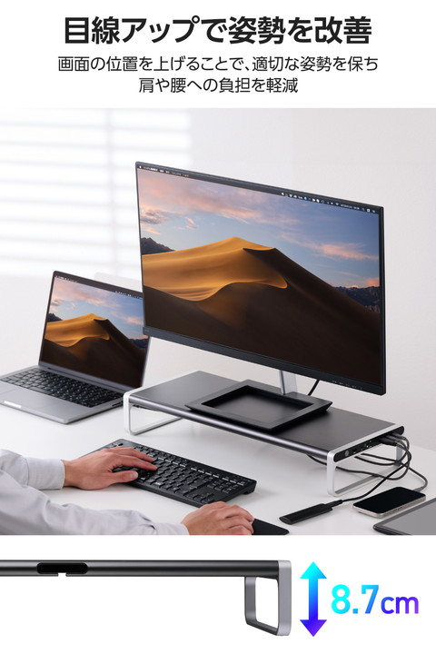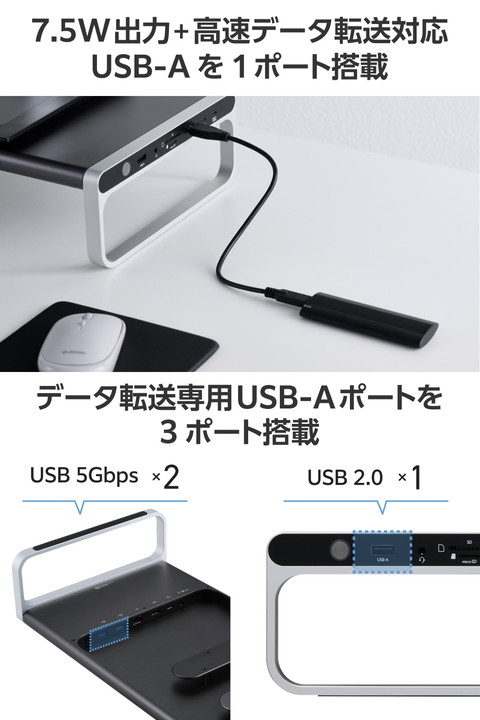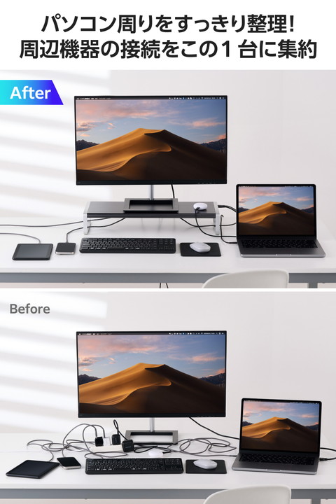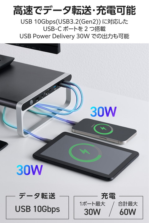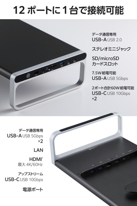 パソコン周りをすっきり整理!周辺機器の接続をこの1台にまとめられる、12in1モニタースタンド型ドッキングステーションです。ノートパソコンやスマートフォンの充電・高速データ転送・映像出力が可能。使いやすいポート配置でケーブルの煩わしさを解消します。![]() ■ケーブル1本でパソコンへ接続し、デバイスの充電・高速データ転送・映像の投影ができる12in1のモニタースタンド型ドッキングステーションです。 ■モニタースタンドに直接ケーブルを挿せるので、周辺機器をこの1台に。デスク周りで場所を取りません。 ■ゆとりある横幅で大きなモニターの設置もしやすいサイズ。最大27インチまでのモニターが設置可能です。 ■使いやすいポート配置でケーブルのごちゃつきを解消します。抜き挿しの頻度の高いイヤホンジャックやSDカードスロットは側面に、挿しっぱなしで使うLANポートやHDMI(R)ポートは裏面に配置しています。 ■付属の専用ACアダプターを接続して、パソコン本体(ホスト)に最大100Wで充電が可能です。 ■USB 10Gbps(USB3.2(Gen2))に対応したUSB Type-C(TM)ポート×2を搭載しています。高速データ転送が可能なほか、USB Power Delivery 30Wでの出力が可能。同時に接続しても合計最大60Wの出力ができるため、スマートフォンやタブレットの高速充電を実現します。 ■USB 10Gbps(USB3.2(Gen2))に対応したUSB-Aポート×1を搭載しています。動画や画像などの高速データ転送もスムーズ。さらに最大7.5Wでデバイスの充電が可能です。 ■USB 5Gbps(USB3.2(Gen1))に対応したUSB-Aポート×2、USB2.0に対応したUSB-Aポート×1を搭載しています。高速データ転送が可能です。 ■パソコンから外部モニターへ映像出力ができるHDMIポート×1(対応解像度:最大4K/60Hz)を搭載しています。 ■※本製品で映像出力を行う際は、機器がDisplayPort(TM) Alt modeに対応していることを確認してください。 ■SDXC/SDHCに対応したSDカードスロットとmicroSDカードスロットを搭載しています。画像・動画などのデータ移行にも便利です。2つのカードスロットは同時に利用できます。 ■φ3.5mm4極ステレオミニジャックにヘッドセットを接続することで、Web会議やオンライン通話などができます。音声出力のみのイヤホンやヘッドホンも使用できます。 ■パソコンを有線ネットワーク接続できるLANポートを搭載しています。 ■パソコン本体との接続は、最大10Gbps(理論値)の高速データ転送を実現するUSB 10Gbps(USB3.2(Gen2))に対応しています。 ■電源ケーブルとACアダプター、USB Type-C - USB Type-Cケーブルを付属しています。 ■※法人で導入を検討される場合は、ご購入前にお客様の環境での検証をおすすめいたします。 ■※接続するUSB Type-Cポート搭載機器の仕様の違いより、一部機能をご利用いただけない場合があります。 ■※USB Type-Cポートからの充電に対応しないパソコンの場合、本製品のUSB Type-Cポート経由での本体充電はできません。充電を行う際は、パソコンがUSB Power Deliveryに対応していることを確認してください。 ■※USB Type-Cポートからの映像出力に対応しないパソコンの場合、本製品の映像出力ポートは動作しません。映像出力を行う際は機器がDisplayPort(TM) Alt Modeに対応していることを確認してください。 ■※本製品はOS起動前のシステム画面やBIOS画面では動作しません。 ■※本製品はパソコン本体のUSB Type-Cポートに直接接続してください。USBハブや増設ボードのUSB Type-Cポートに接続した場合、本製品をご利用いただけません。 ■※USB Type-C and USB-C are trademarks of USB Implementers Forum. ■自社環境認定基準を1つ以上満たし、『THINK ECOLOGY』マークを表示した製品です。 ■環境保全に取り組み、製品の包装容器におけるプラスチック重量を、社内基準製品より20%以上削減した製品です。 ■環境保全に取り組み、製品の包装容器が紙・ダンボール・ポリ袋のみで構成されている製品です。 ![]() ■対応OS(Windows):Windows 11/10 ■対応OS(macOS):macOS Sequoia15/macOS Sonoma 14 ■対応OS(iPadOS):iPadOS 18/17 ■対応OS 備考:※各OSの最新バージョンへのアップデートや、サービスパックのインストールが必要になる場合があります。 ■コネクター仕様(アップストリーム):USB Type-C(TM)ポート<USB 10Gbps(USB3.2(Gen2))>、USB Power Delivery対応(最大出力100W ※ただしダウンストリームのUSB Type-Cポート使用時は最大出力65W)、DisplayPort(TM) Alt mode (USB2.0接続時はUSB2.0互換で動作(USB2.0時は映像出力非対応)) ■USBポート(ダウンストリーム)(1):USB Type-Cポート<USB 10Gbps(USB3.2(Gen2))>×2 ※1ポート30W、2ポート合計60WまでのUSB Power Deliveryに対応。映像出力には対応していません。 ■USBポート(ダウンストリーム)(2):USB-Aポート<USB 10Gbps(USB3.2(Gen2))>×1 ※供給電力値最大7.5W(5V/1.5A) ■USBポート(ダウンストリーム)(3):USB-Aポート<USB 5Gbps(USB3.2(Gen1))>×2 ※供給電力値最大4.5W(5V/0.9A)(データ通信専用) ■USBポート(ダウンストリーム)(4):USB-Aポート<USB 2.0>×1 ※供給電力値最大2.5W(5V/0.5A)(データ通信専用) ■映像出力ポート(ダウンストリーム):HDMI(R)×1<対応解像度:最大4K/60Hz> ■LANポー
