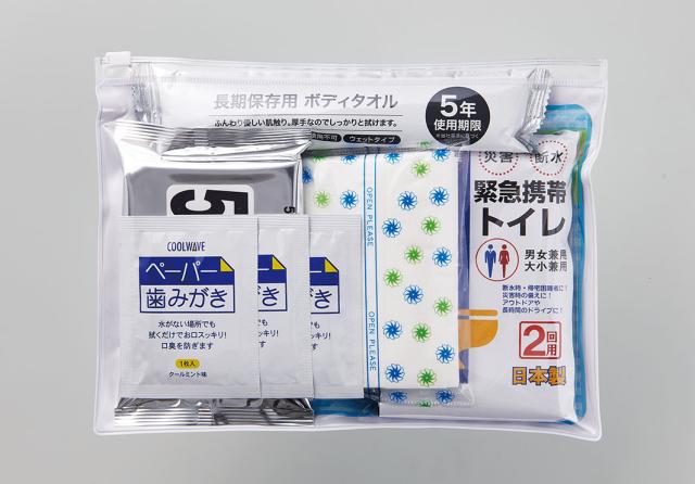 スライダー付ケース、シャンプー手袋、ウェットティッシュ(20枚)、携帯トイレ(大小兼用)2P、ポケットティッシュ、ペーパー歯磨き×3、長期保存用ボディタオル