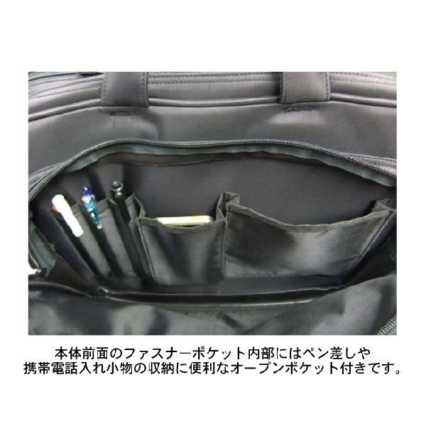 本体前面のファスナーポケット内部にはペン差しや携帯電話入れ小物の収納に便利なオープンポケット付きです。