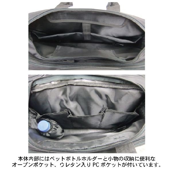 本体内部にはペットボトルホルダーと小物の収納に便利なオープンポケット、ウレタン入りPCポケットが付いています。