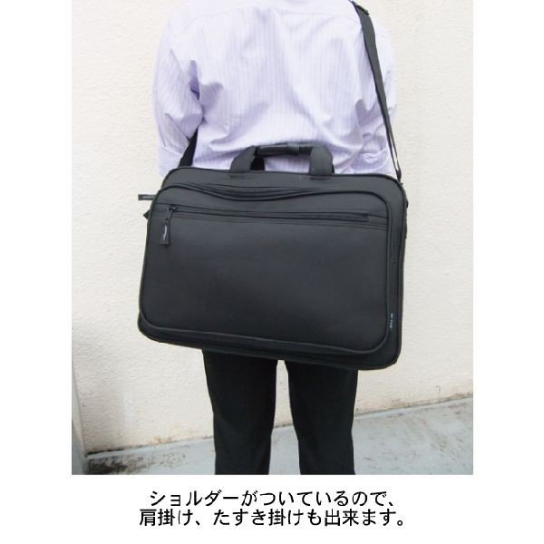 | 本体前面のファスナーポケット内部にはペン差しや携帯電話入れ小物の収納に便利なオープンポケット付きです。 本体天部には名刺入れやキーケース等を収納しておくのに便利な小さめのファスナーポケット付きです。 本体内部にはペットボトルホルダーと小物の収納に便利なオープンポケット、ウレタン入りPCポケットが付いています。 ショルダーが付いているので、肩がけ、たすき掛けも出来ます。 |