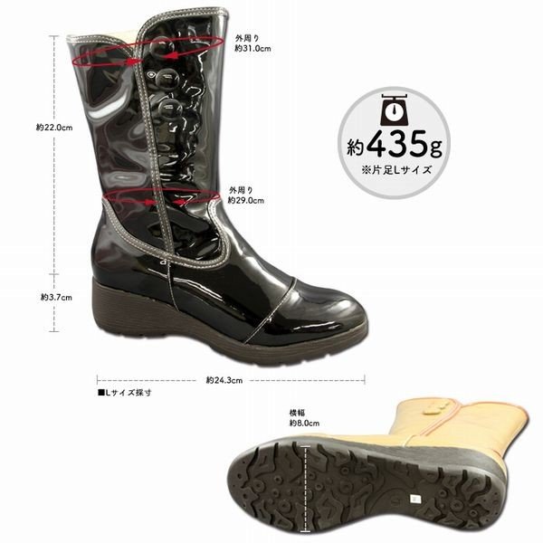 | □アッパー素材:合成皮革 □底材:合成底 □ヒール高さ:約3.7cm □片足重量 約435g(Lサイズ時) ※完全防水ではありません。 |