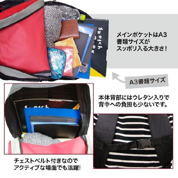 | 30Lの大容量サイズデイパック! ポケットもたくさんあり、A3サイズも楽ー入る大きさです。 旅行や防災用など多用途に渡り活躍できる商品です。 |