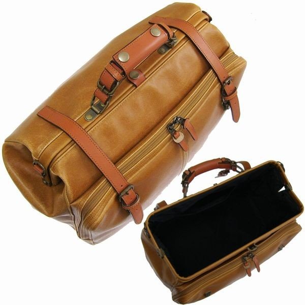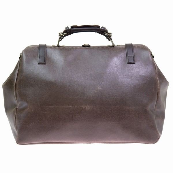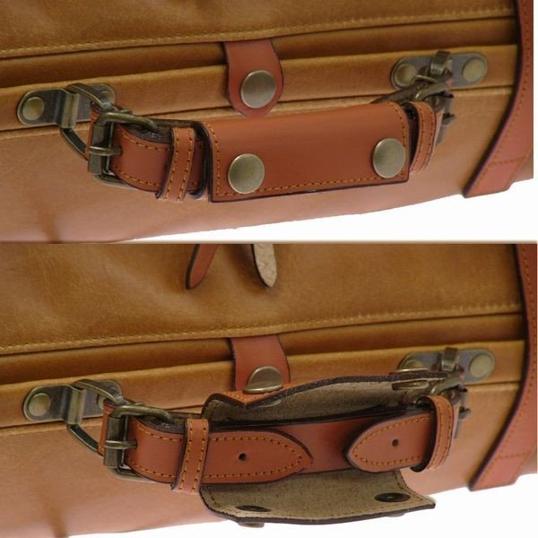 | 少し小さめサイズを作りました。 少しだけサイズダウンしています。 女性や、小柄な男性でも違和感なく持って頂けます。 体は白いPVC(ポリ塩化ビニル)の層の上に色の付いたPVCの層を重ねることで、折れ曲がった凸部分が白く変化する加工を施した生地です。 雨や雪で汚れてもお手入れが簡単です。 ハンドル部分は本革製で、使うほどに手になじみ3段階調整できます デザインのアクセントにもなっている2本のベルトや、ファスナーの引手なども本革製です。 開閉は、2本のベルトに取り付けられている差込式の錠前をそれぞれ外し、口枠に取り付けられたホックを外して行います。 本体内部は大きな空間になっていますので、なんでもポイポイ入れる事が出来ます。 開口部には枠が入れてありますので、しっかりと開いて型崩れもし難くなっています。 本体前面のファスナーポケットもマチ幅が4.5cmあり、サブルームとして申し分ない使用が出来ます。 本体底面に金属製の底鋲が4つついています。 本体と同素材のショルダーベルトも付属していますので荷物が多くなっても安心です。 |