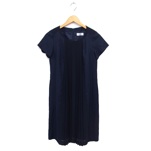 【中古】ジェイプレス J.PRESS ピンタック ワンピース フレア ひざ丈 シフォン ラウンドネック 半袖 9 紺 ネイビー