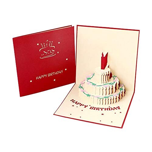 oumii 誕生日カード ケーキ 立体カード バースデ グリーティングカード ポップアップカード メッセージカード 感謝 誕生日 お祝い 封筒付き 2色 (レッド)