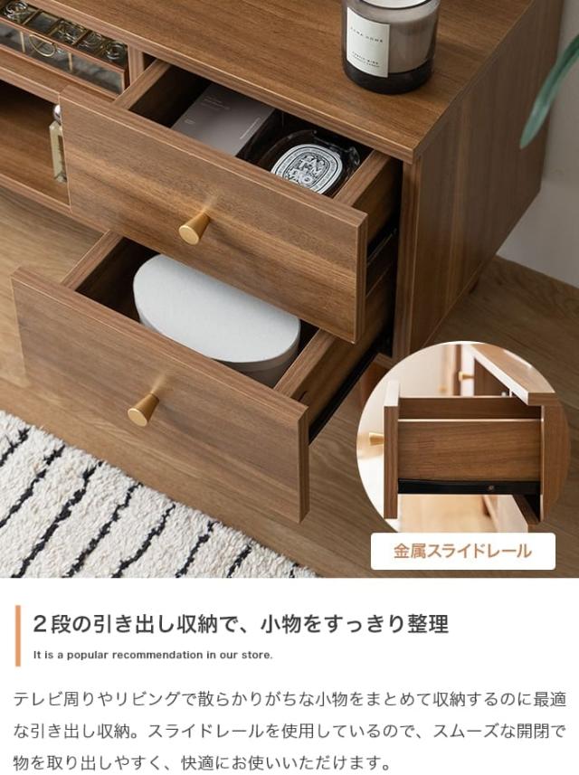 リアルな木目調とゴールドの取っ手が目を惹く、上品で温かみのあるテレビボードです。