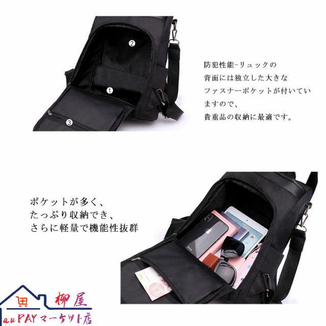 | 女性らしいサイズ感と実用性を兼ね揃えた防犯リュック? 防犯性能-リュックの背面には独立した大きなファスナーポケットが付いていますので、貴重品の収納に最適です。 3WAY仕様リュック-肩掛け、手提げ、リュックとしても使用出来る3wayのリュックサックです。 上質な高品質ナイロン素材を採用、雨の日も安心してご使用いただけます。 ポケットが多く、たっぷり収納でき、さらに軽量で機能性抜群 | |