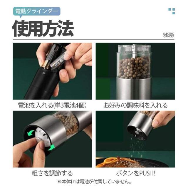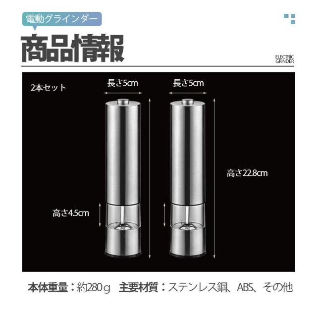 【2個セット】電動ミル ペッパーミル 電動 電動ミル ソルト&ペッパー 粗さ調節可能 ソルトミル 岩塩 ペッパー 胡椒 スパイスミル 片手操作 料理器具