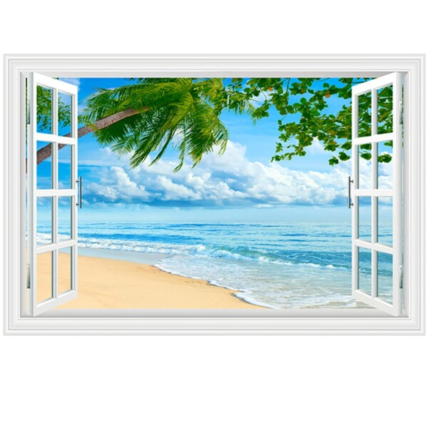 HOTIYOK 偽窓 ステッカー ウォールステッカー 窓 海 窓の景色 絵画風 壁紙ポスター 青い空と海 雲海 鏡の湖面 ハワイ トロピカルビーチ トロピカル 木 壁紙シール 剥がせる おしゃれ 窓シ