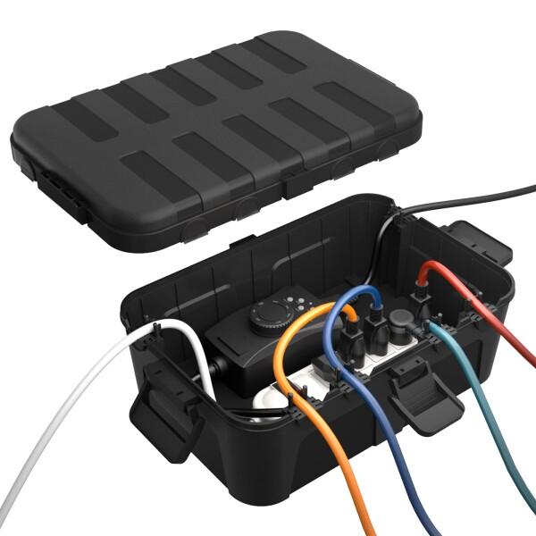 使いやすい:4つのラッチを引いたり押したりするだけで、ボックスを開閉できます。電源を接続し、クランプでコードを留めます。ボックスを壁に取り付けるには、裏側にある2つの鍵穴を使用します。