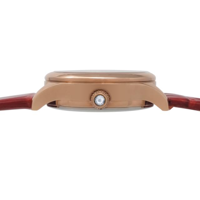 また、バンドには型押し加工を施したカーフレザーを採用し、シックでありながらも洗練された高級感を纏わせています。バンド幅は12mmにすることで「ロイヤルレッド」の主張を抑え、美しさが引き立つようにしています。バンドの裏材には、優れた耐久性や適度な通気性・透湿性を実現する東レ株式会社が開発したスエード調の人工皮革を採用しています。