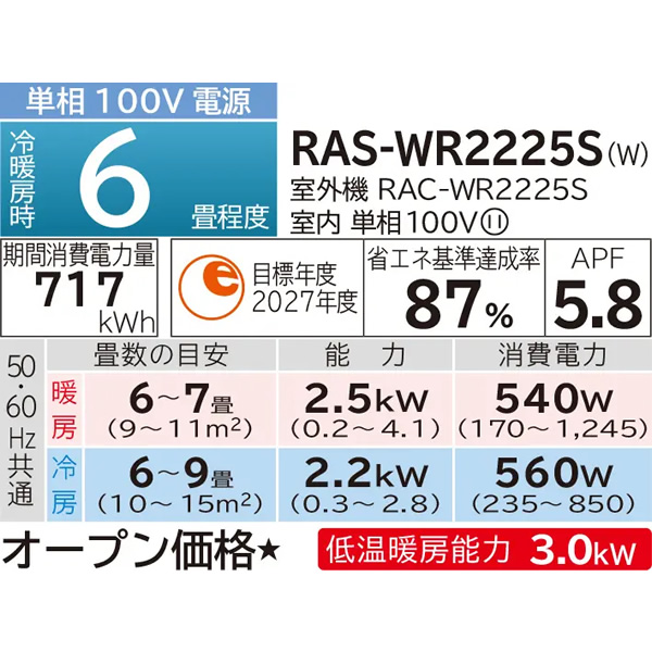 メーカー型番:RAS-WR2225S-W