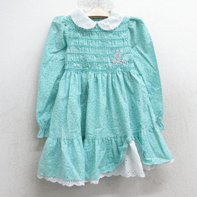 古着 長袖 ワンピース キッズ ガールズ 子供服 80年代 80s 花 葉 総柄 コットン 緑他 グリーン 中古 古着