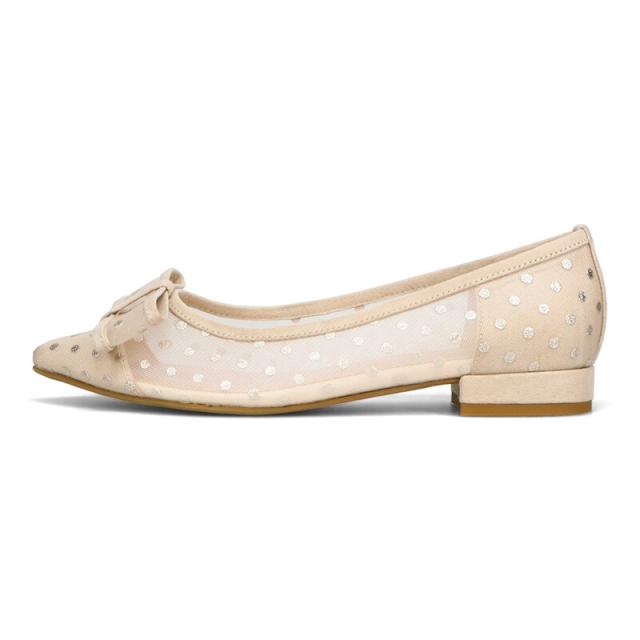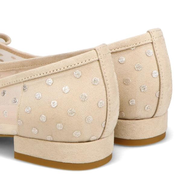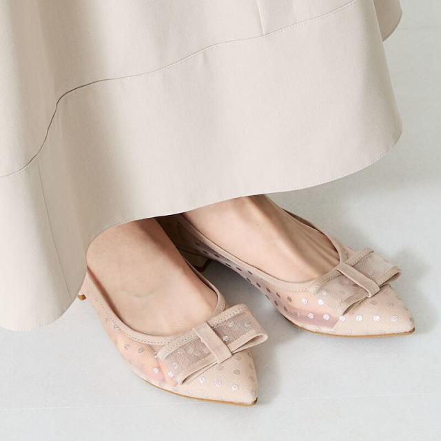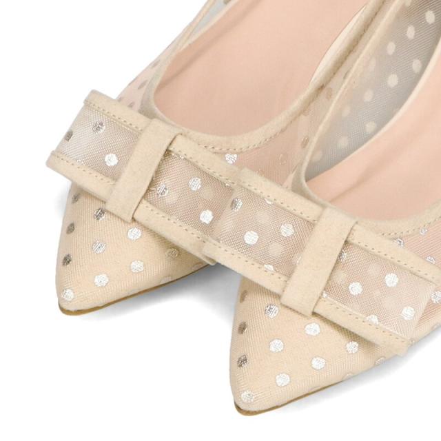 チュールとサテンの素材を組み合わせたフェミニンなフラットパンプスは、ドットやトップのリボンなどかわいらしい要素をたくさん詰め込んだアイテム。