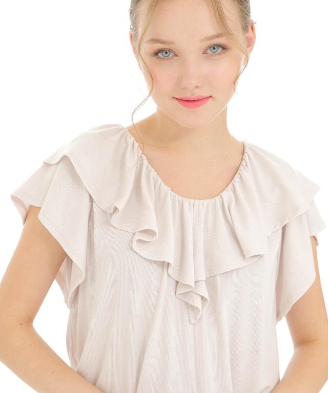 襟フリルは胸元をカバーしてくれるのでバストラインを気にせず一枚で着用しても安心です。