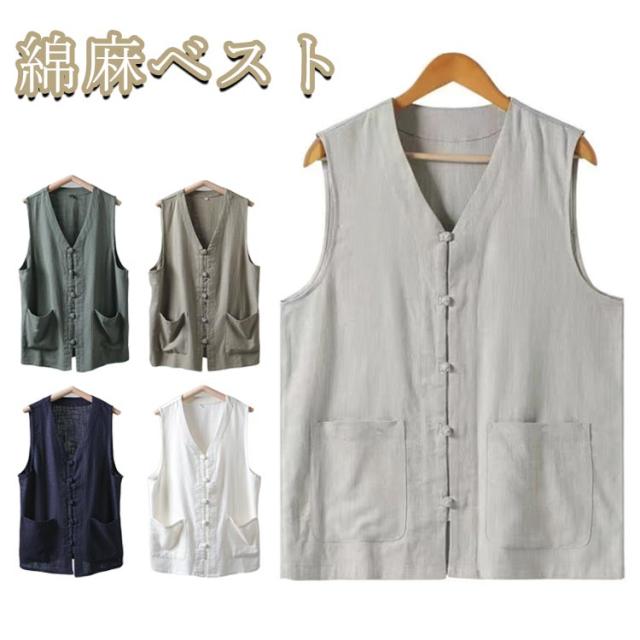 涼しい 夏 ビジネス 細身 紳士 チャイナボタン 個性的 メンズ リネンベスト トップス 綿麻ベスト 前開き 綿麻 無地 カジュアルベスト 薄手 ノースリーブ サマージャケット 春服 夏服 40代 50代 60代 父の日 チャイナ風 30代 リゾート 涼しい 散歩 軽量