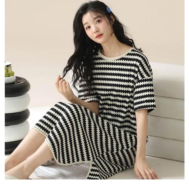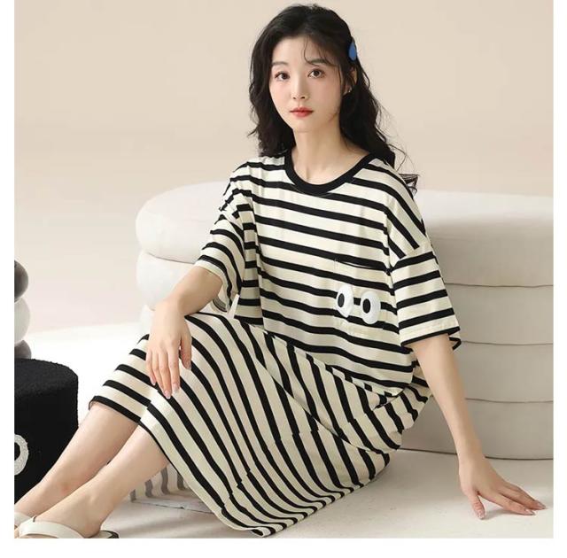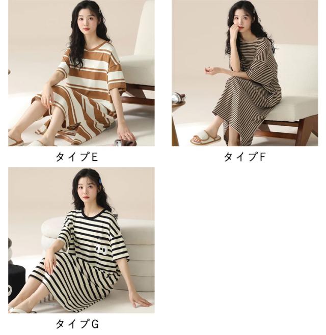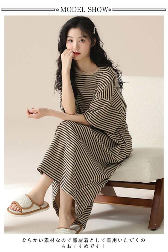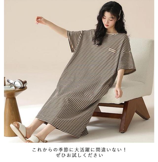 ルームワンピース リラックスウェア 部屋着 寝巻 ボーダー 透けない 丸首 膝下 寝間着 レディース 半袖 大きいサイズ ミモレ丈 ボックスワンピ マタニティ シンプル おしゃれ クルーネック パジャマ 涼感 涼しい 春夏 夏用 体型カバー