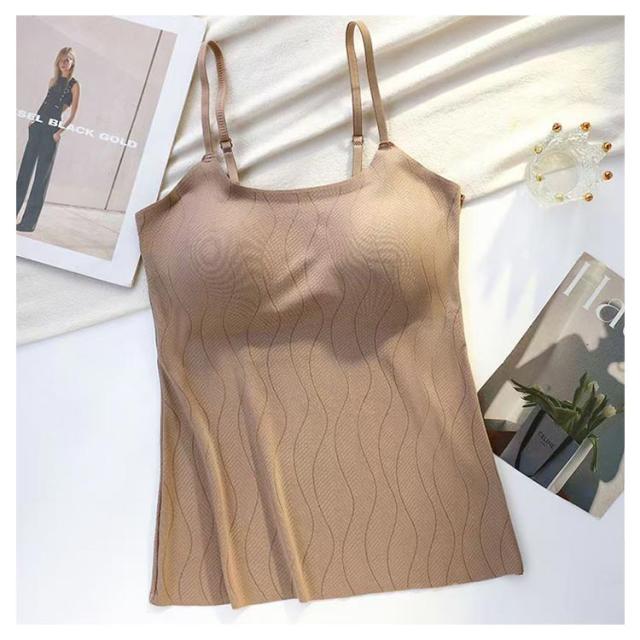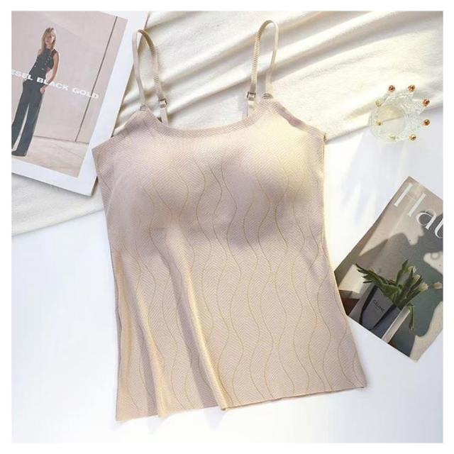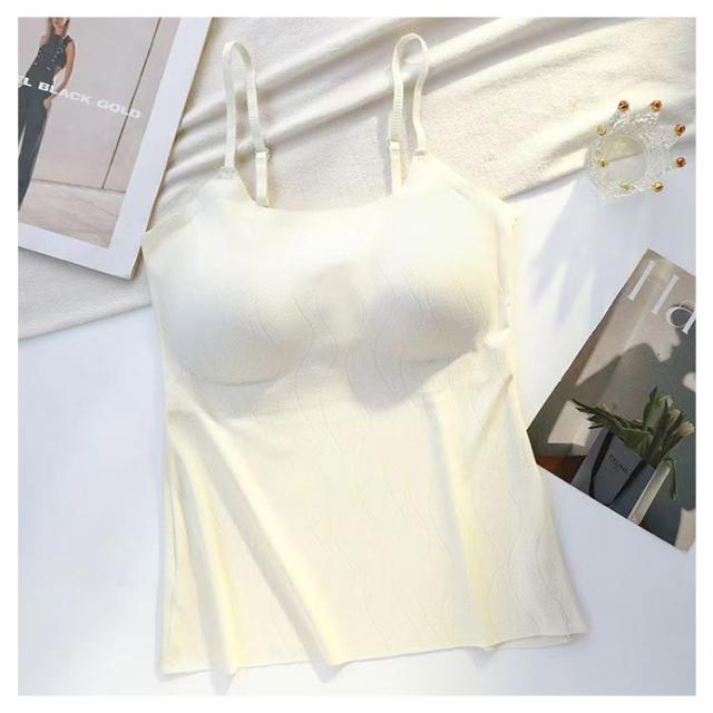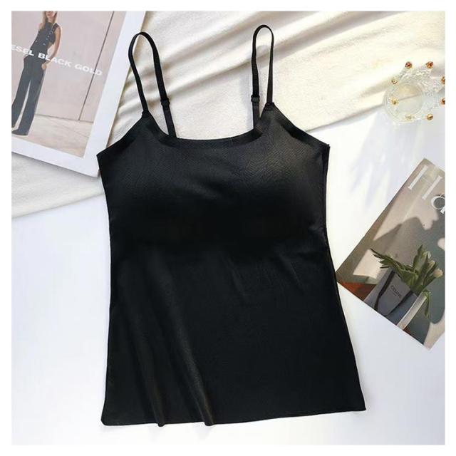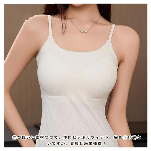 | スタンダードなデザインのカップ付きのキャミソールです。 しなやかな肌触りで伸縮性もバツグン! 伸び性いい素材なので、体にピッタリフィット、締め付け感ないですが、着?せ効果抜群! | |
