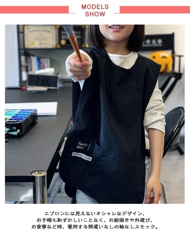 | ベスト感覚で使えるエプロン。 エプロンには見えないオシャレなデザイン、お子様も恥ずかしいことなく、お絵描きや外遊び、お食事など時、愛用する間違いなしの袖なしスモック。 撥水性抜群スモック、子供服や制服を汚さないためにも、入園準備にそろえておきたいアイテム。 ノースリーブデザイン、サイドスリット入りでお子様の動きの邪魔にならず夏の暑い時期にもご利用いただけます。 お絵描きや工作、泥遊び、砂遊び、習字、調理実習など時に着ていると安心と安心の子供エプロン、お洋服を汚れから守ってくれる1枚。 アウトドアシーンでの着用はもちろん、デイリースタイルにも欠かせない大人顔負けのお洒落ベストタイプエプロン。 | |