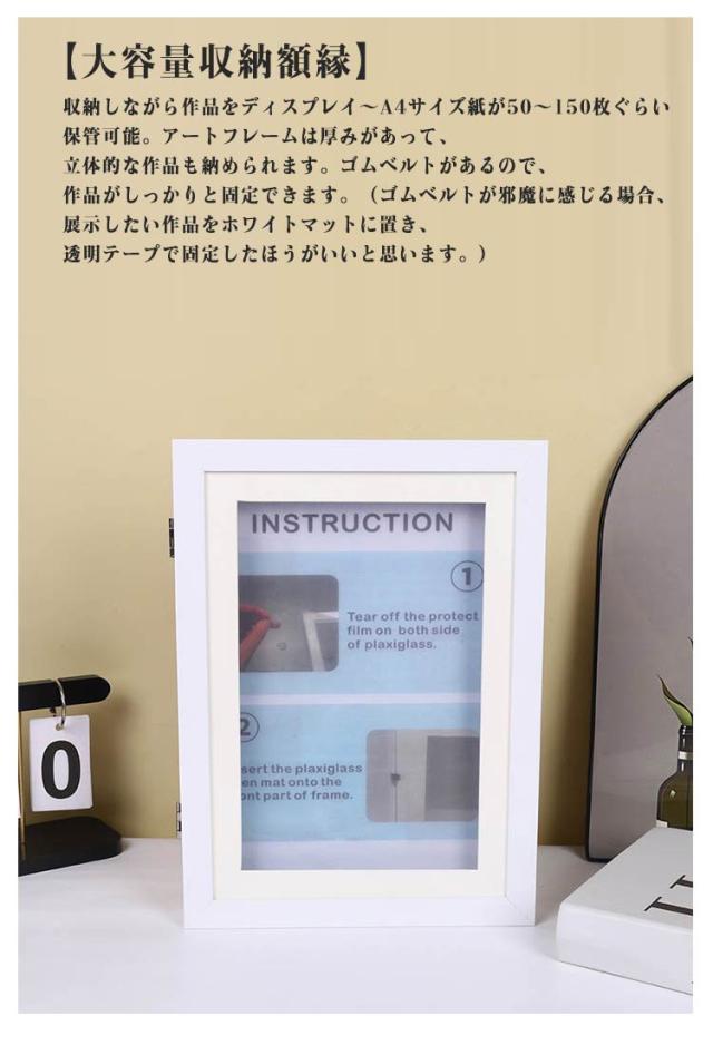 | 【アクリルシート】前面板には透明アクリル製シートを採用。ガラス素材より軽くて安全、破損を防ぐことができます。透明度が高くて子供の写真や作品のディスプレイに最適。 【開閉便利なマグネット扉】枠には磁石で簡単に開け閉めることができ、絵画作品の入れ替えも便利になります。(作品を頻繁に入れ替えたい方に最適です) 【大容量収納額縁】収納しながら作品をディスプレイ〜A4サイズ紙が50〜150枚ぐらい保管可能。アートフレームは厚みがあって、立体的な作品も納められます。ゴムベルトがあるので、作品がしっかりと固定できます。(ゴムベルトが邪魔に感じる場合、展示したい作品をホワイトマットに置き、透明テープで固定したほうがいいと思います。) 【横縦兼用な壁掛け式】アートパネル後の留め具の距離は同じなので、壁掛けは縦向けでも横向けでも対応できます。 | |