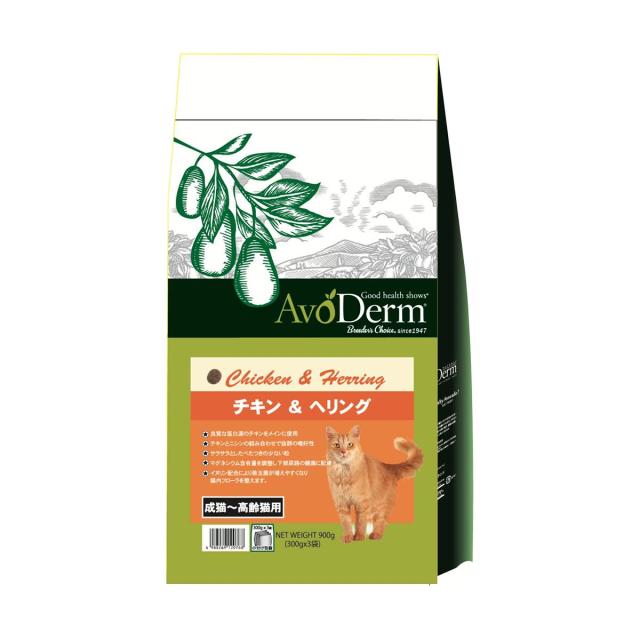 成猫〜高齢猫におすすめの総合栄養食です。原材料にチキンとニシンのダブルのタンパクに加え、アボカド果肉&オイルを配合しています。