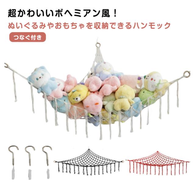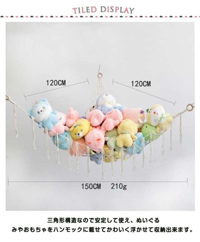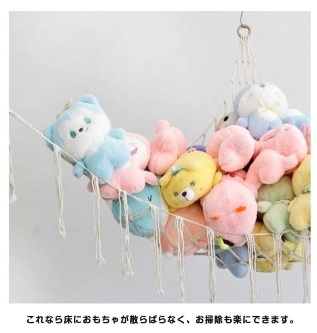 | 超かわいいボヘミアン風!ぬいぐるみやおもちゃを収納できるハンモック 三角形構造なので安定して使え、ぬいぐるみやおもちゃをハンモックに載せてかわいく浮かせて収納出来ます。 ざっくりとした網目とフリンジがおしゃれで、ちょっとした子供部屋のアクセントになります。 これなら床におもちゃが散らばらなく、お掃除も楽にできます。 使わないときは、コンパクトにまるめて収納することができるから、便利です。 | |