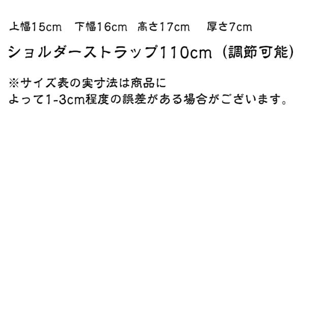 | サイズについての説明 | 上幅15cm、下幅16cm、高さ17cm、厚さ7cm、ショルダーストラップ110cm(調節可能) |