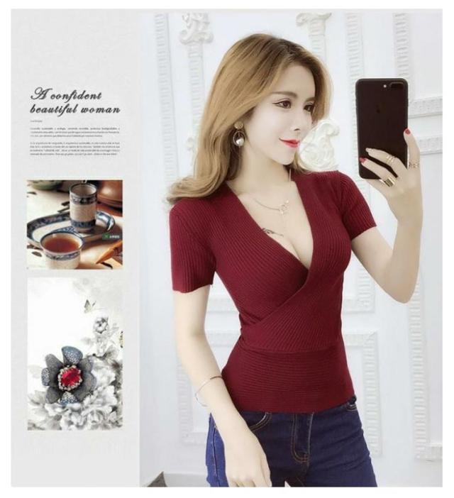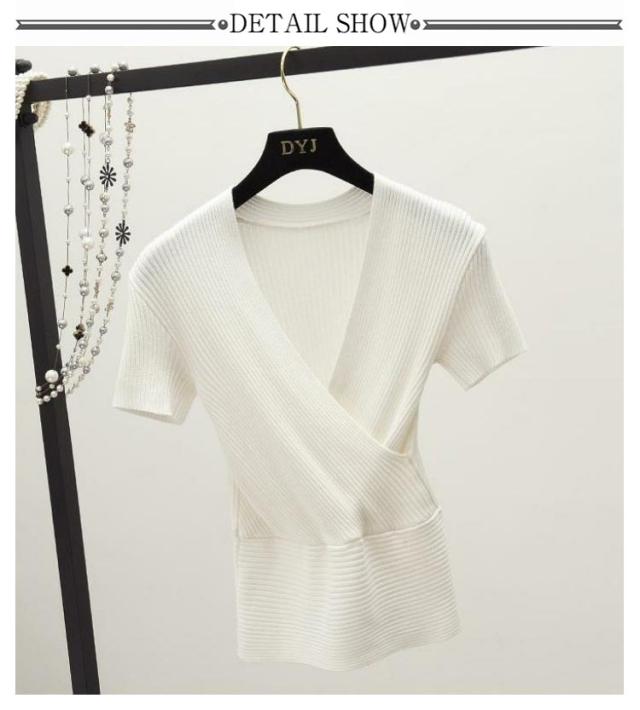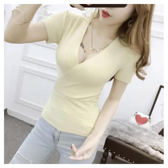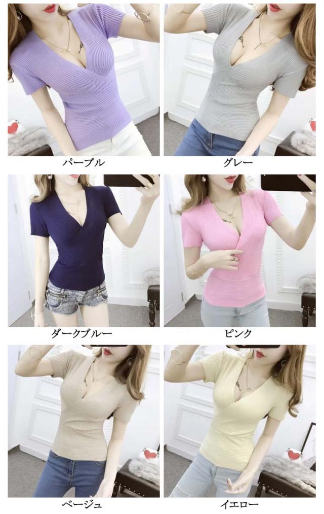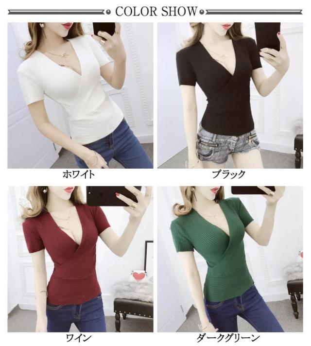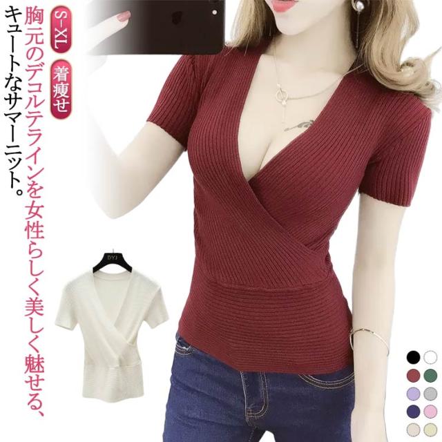 春 半袖 送料無料 半袖 vネック セクシー サマーニット 夏 ニット 薄手 深い ショート丈 レディース 胸元 セクシー きれいめ 着痩せ 無地 タイト フィットネス