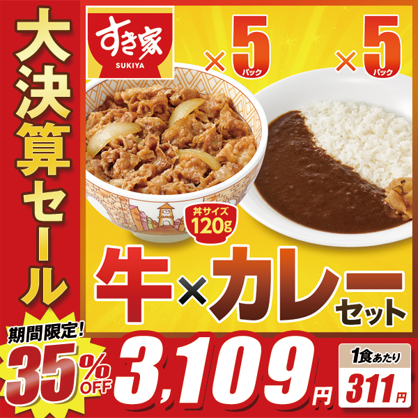 すき家「牛丼の具120g」「横濱カレー220g」がそれぞれ5パックずつ、合計10パック入りのお得なセットです。