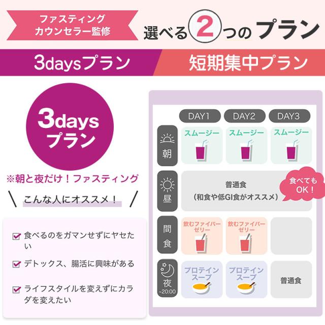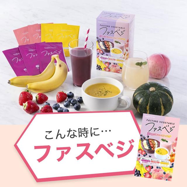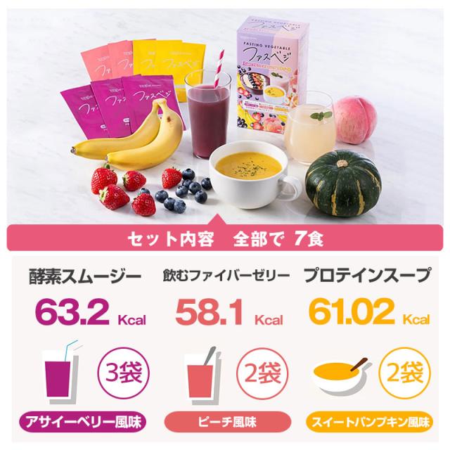 【ベジエナチュラル ファスベジ 3daysプチファスティング アサイーin】は、酵素スムージー・ファイバーゼリー・プロテインスープが入った3日間集中のダイエットサポートセットです。