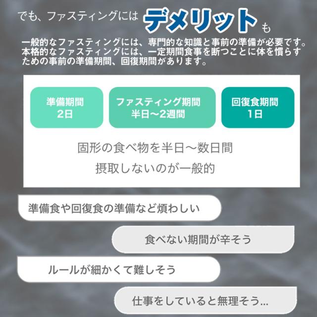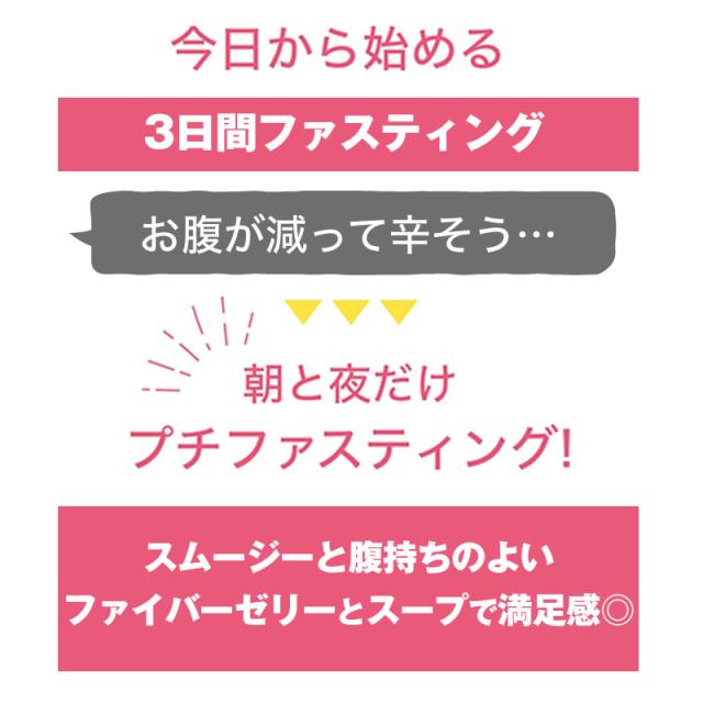 | 商品説明 | ファスティングカウンセラー監修のプチファスティング! ・酵素スムージーと飲むファイバーゼリー&プロテインスープの7食セット プチファスティングは3日間だけでOKの短期プラン。 準備食や回復食が不要なためその日からすぐにプチファスティングが始められる、初心者にもやさしいセットです。 ・美味しく満腹感続く。 満腹サポートファイバー配合飲みごたえが高いグルコマンナンや食物繊維をたっぷりと配合。満腹サポートファイバーがお腹のなかで膨らみ空腹感が軽減させるため、最後まで無理なく続けられます。 ・選べる2つの「3daysプラン」「短期集中プラン」 【3daysプラン】 ・食べるのをガマンせずにヤセたい ・デトックス、腸活に興味がある ・ライフスタイルを変えずにカラダを変えたい 【短期集中プラン】 ・週末にカラダをリセットしたい ・外食が続いて体重が増えた ・デートやイベント、健康診断前などに |