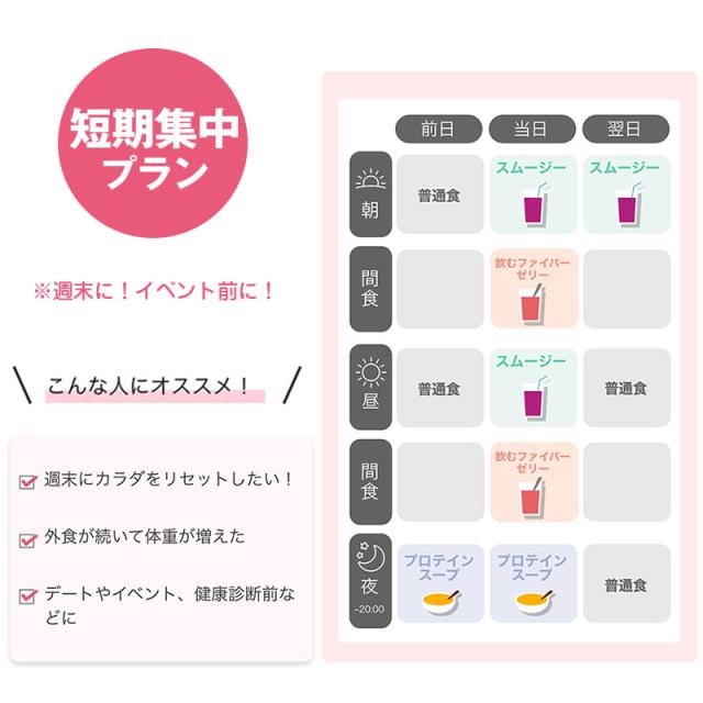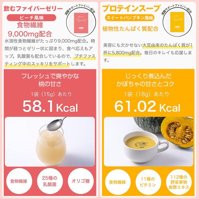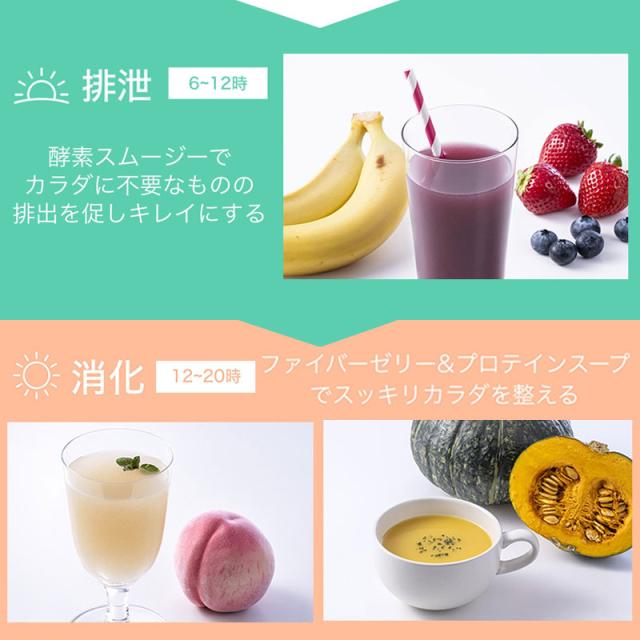 | セット内容 | 酵素スムージー20g×3袋 飲むファイバーゼリー15g×2袋 プロテインスープ18g×2袋 |