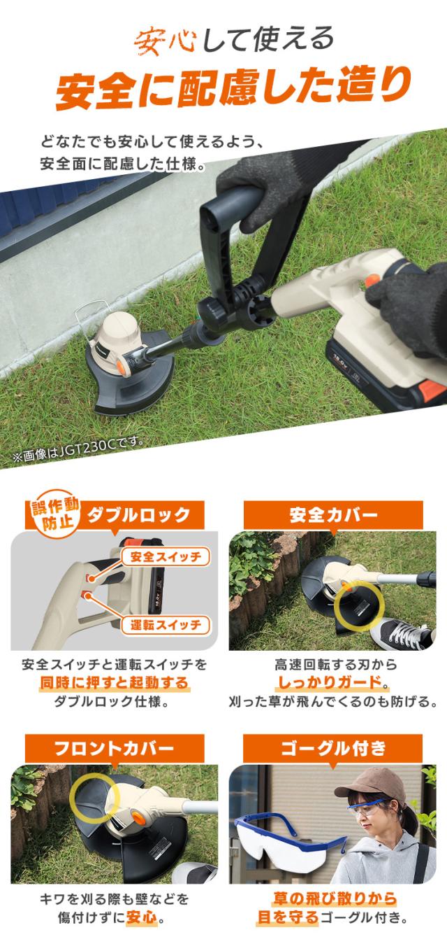 金属刈刃(型番:JGTKB16M)、ナイロン刈刃(型番:JGTKB16N)、充電式リチウムイオンバッテリー(型番:DBL1820C)