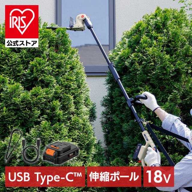 (検索用:Type-C充電&バッテリー共用できる・ポールヘッジトリマー・充電式・18V・電動・軽量・最大1.8m・高所・生垣・高枝・庭木・植木剪定・コンパクト・肩掛けストラップ・4967576744102・アイリスオーヤマ)