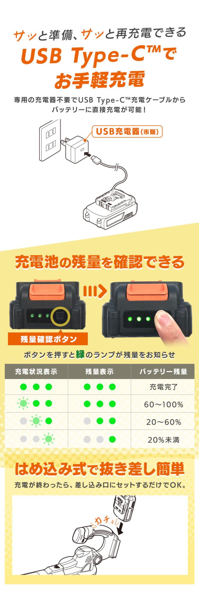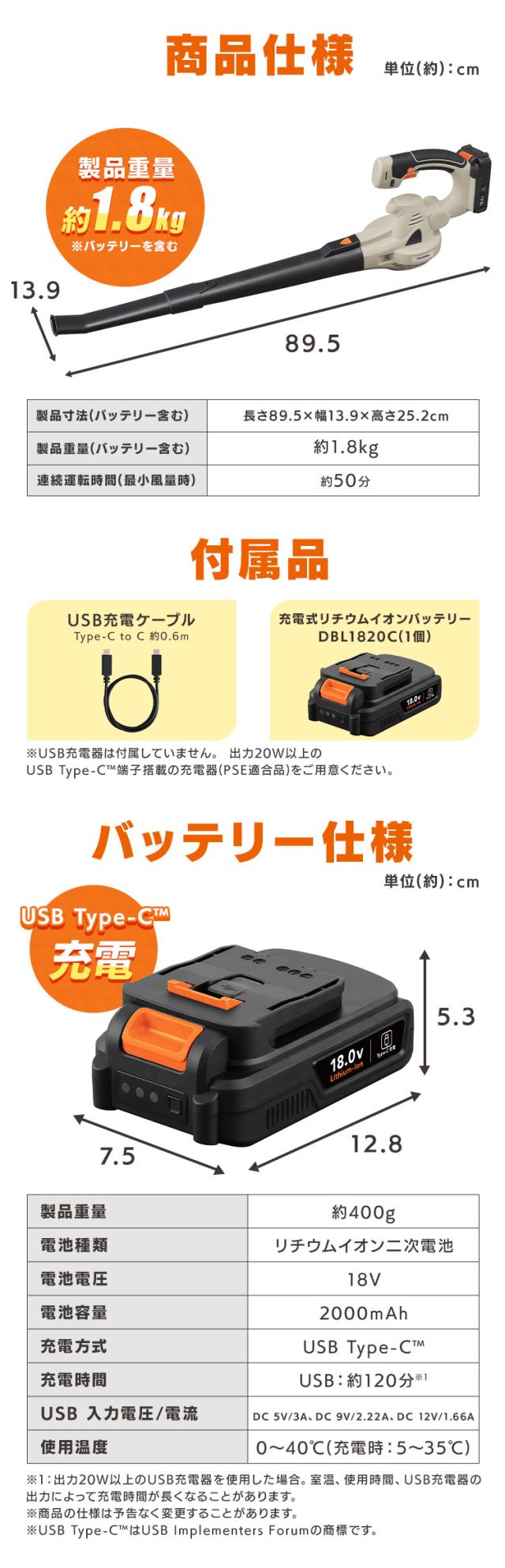 充電式リチウムイオンバッテリー(型番:DBL1820C)、USB充電ケーブル(Type-C to C)