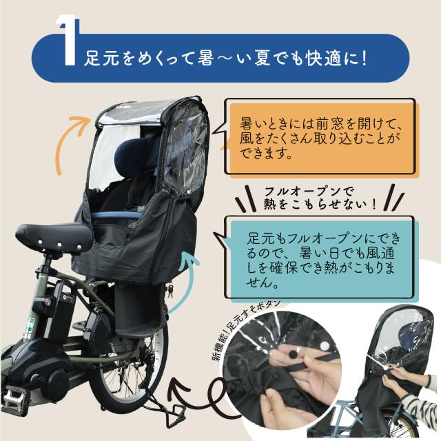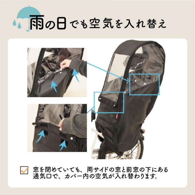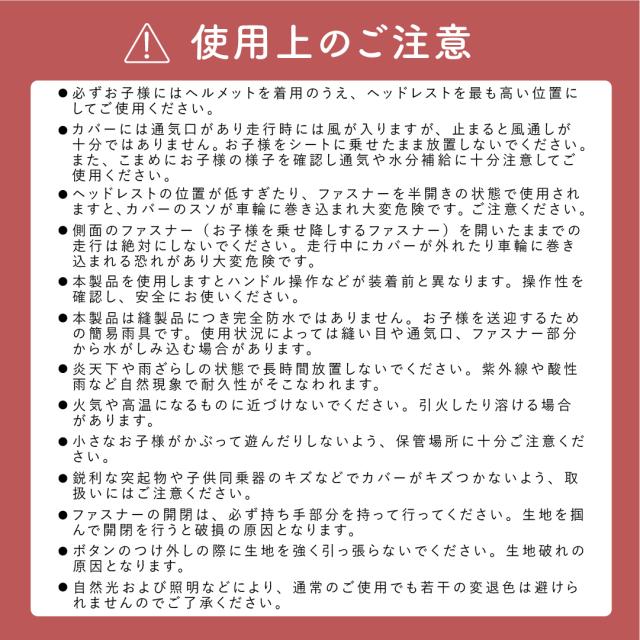 ●カバーには通気口があり走行時には風が入りますが、止まると風通しが十分ではありません。お子様をシートに乗せたまま放置しないでください。また、こまめにお子様の様子を確認し通気や水分補給に十分注意してご使用ください。
