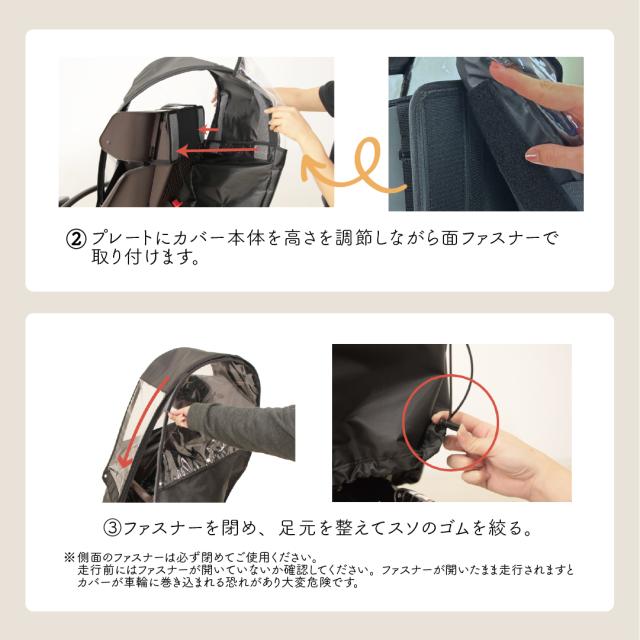●側面のファスナー(お子様を乗せ降しするファスナー)を開いたままでの走行は絶対にしないでください。走行中にカバーが外れたり車輪に巻き込まれる恐れがあり大変危険です。