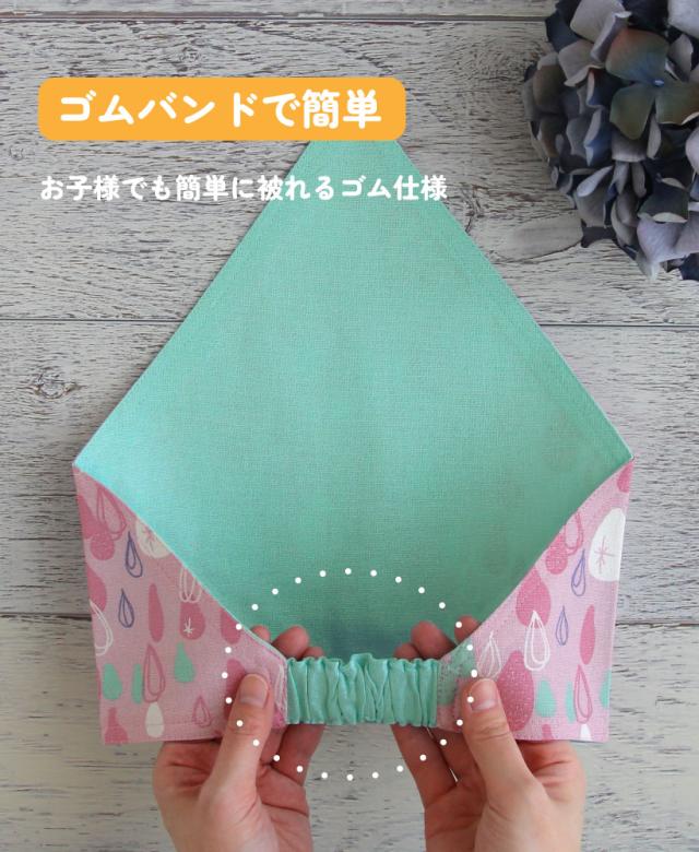 お子様でも簡単に被れるゴムバンドタイプの三角巾。インド綿のツイル素材を使用しており、シワになりにくく手触りが良いことが特徴です。お家でのお手伝いや、保育園・幼稚園・小学校にも使えて色々なシーンで大活躍!リバーシブルになっているので、お好きな色柄の方で着用可能◎