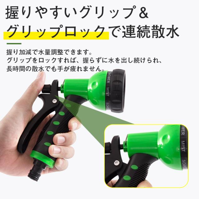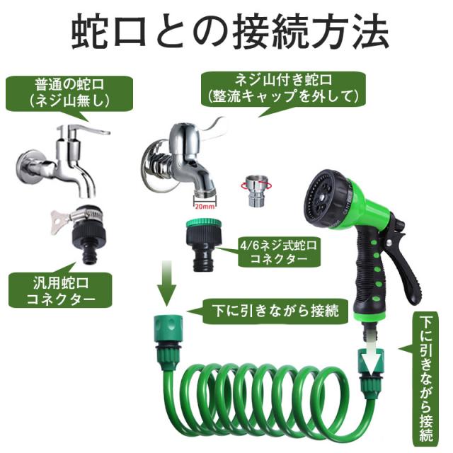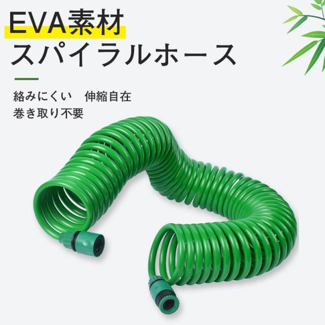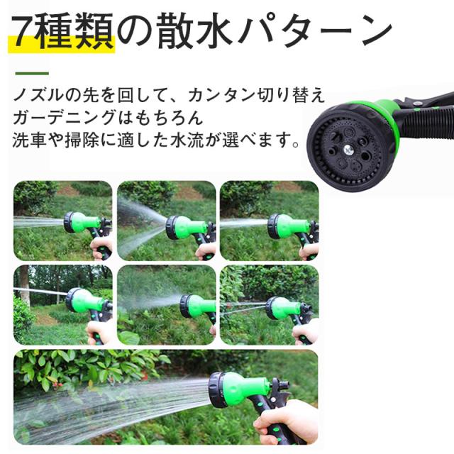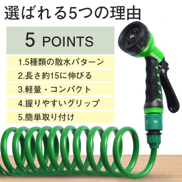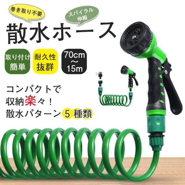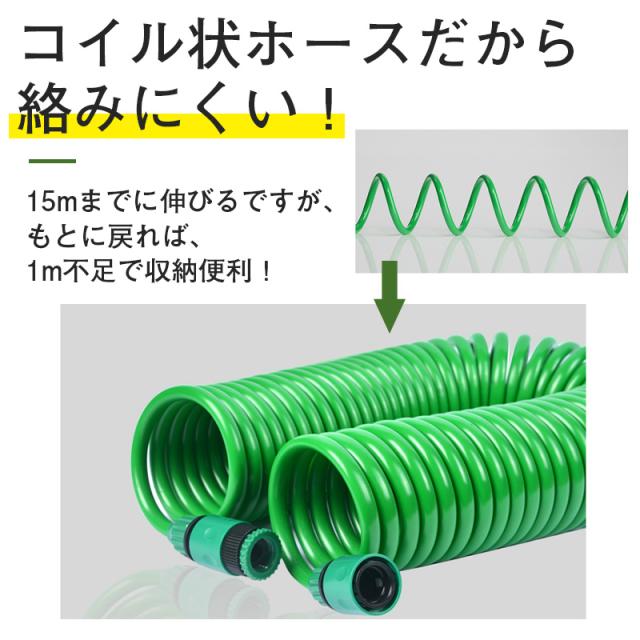 伸びるホース 15m 散水ホース 巻き取り不要 伸縮 スパイラル ホース 噴射パターン シャワー 洗車 掃除 水やり ノズル付き 延長 ガーデニング