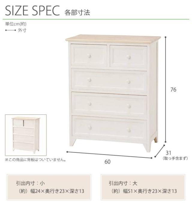 シャビーホワイトの本体にアンティーク調ナチュラルな天板が映える、シンプルチェスト。