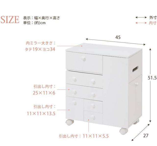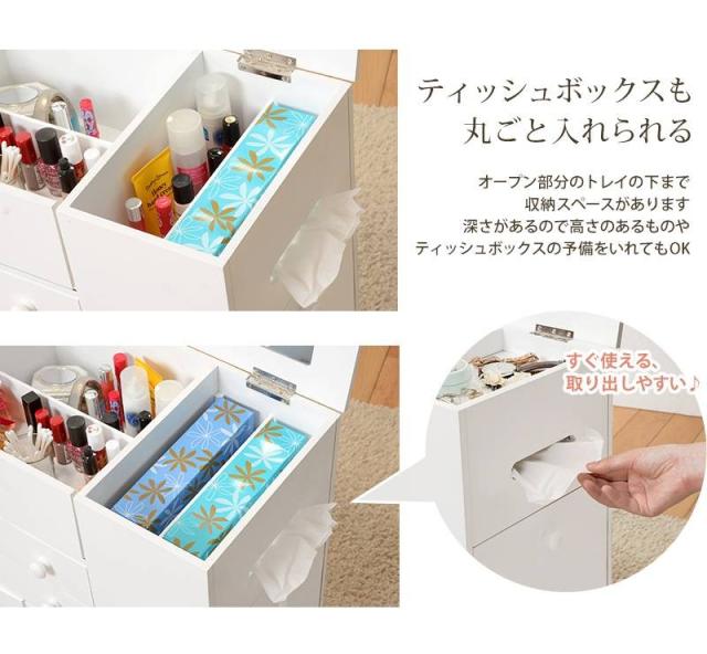 大容量のコスメワゴン。ボックスティッシュ収納やダストボックス付きで散らかりません。キャスター付きで移動も楽々。