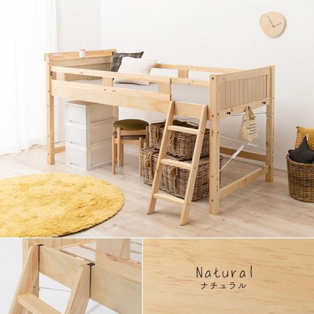 ロフトベッド 木製 天然木 すのこベッド 宮棚付き 2口コンセント付き ベッド下スペース ベッド下収納 ロフトベッドフレーム